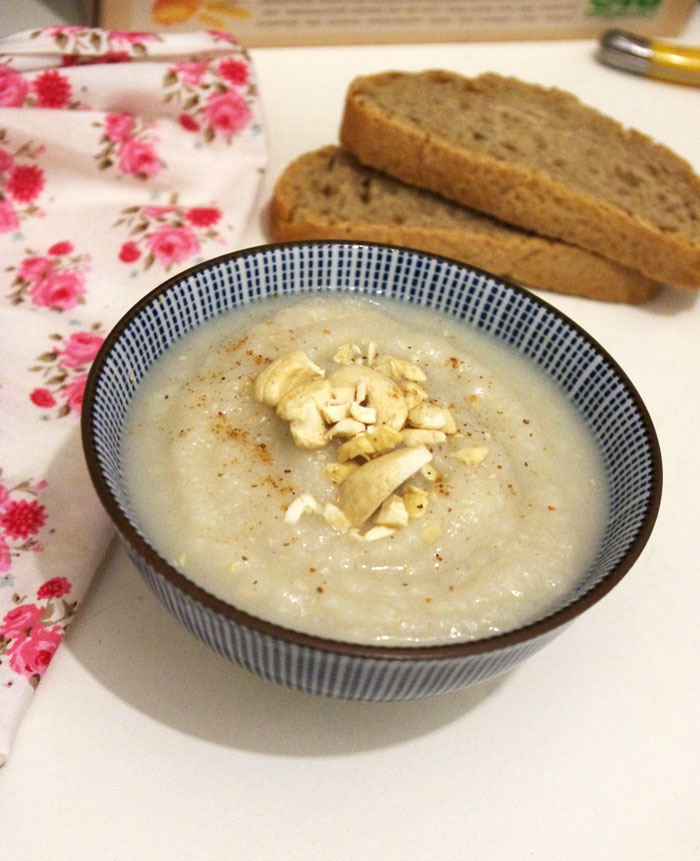 Envie d’une bonne soupe qui réchauffe avec ce froid hivernal ? Je vous partage une recette ultra simple à réaliser de soupe de chou-fleur. C’est bon, c’est doux, c’est plein de vitamines C et c’est idéal en début de repas, à accompagner de tartines ou de croutons. J’aime beaucoup cette soupe car c’est une manière différente de cuisiner le chou-fleur et j’aime le mélange croquant avec les noix de cajou 🙂