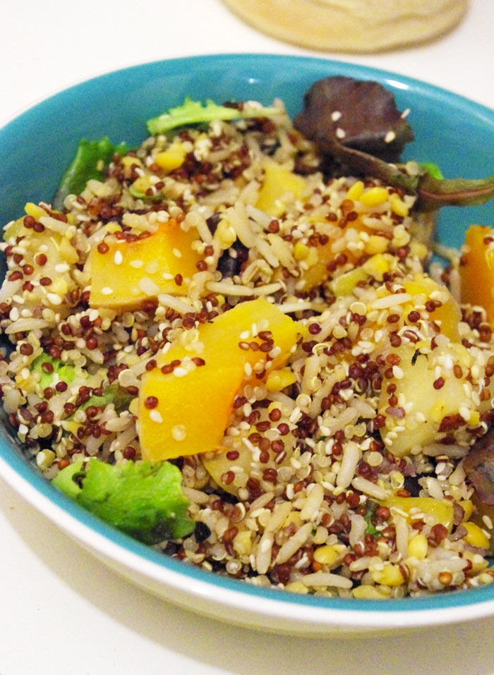Vous aimez manger des salades en hiver, vous ? Moi oui, à condition qu’elles soient de saison, comme cette salade quinoa, pomme et butternut. Elle est complète, végétarienne et délicieuse, essayez-la 🙂 Vous pouvez varier les plaisirs en remplaçant le quinoa par un mélange comme je propose ici de deux variétés de quinoa et de riz.
