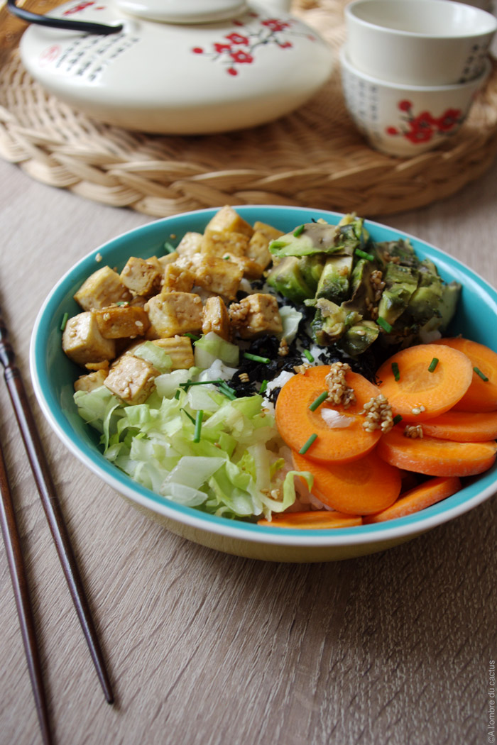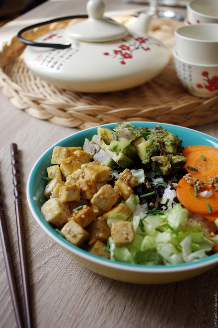 Il y a quelques mois, j’ai vu passer cette recette sur le blog de « 100% végétal » et j’ai tout de suite eu envie de l’essayer. Je n’avais goûté que des chirashi au saumon et ce qui m’a le plus étonnée dans ce chirashi végétarien, c’est le tofu ! Je suis pas fan de tofu mais revenu dans l’huile de sésame, recouvert de grains de sésame dorés et mélangé avec le reste des ingrédients, c’est délicieux !