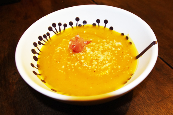 Placez les morceaux de courge avec le jambon fumé taillé grossièrement dans le bol d’un mixeur puis ajoutez du bouillon. Mieux vaut en mettre une petite quantité, quitte à en rajouter par la suite.